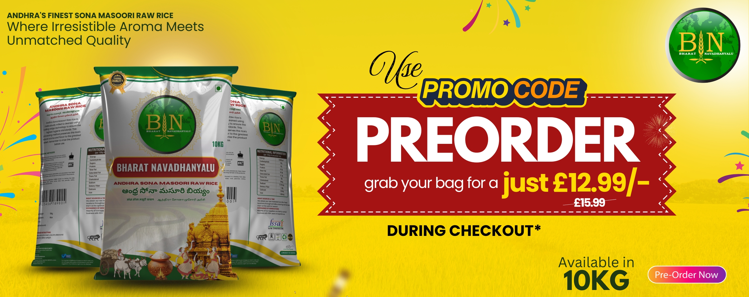At Bharat Navadhanyalu, we bring the finest Indian groceries and essentials straight from Andhra Pradesh to the UK, ensuring authenticity, freshness, and unbeatable quality. As a trusted importer and wholesale supplier, we take pride in offering a diverse range of premium products, including Andhra Sona Masoori Rice, aromatic basmati rice, rich Indian spices, lentils, ready-to-eat meals, snacks, and more.